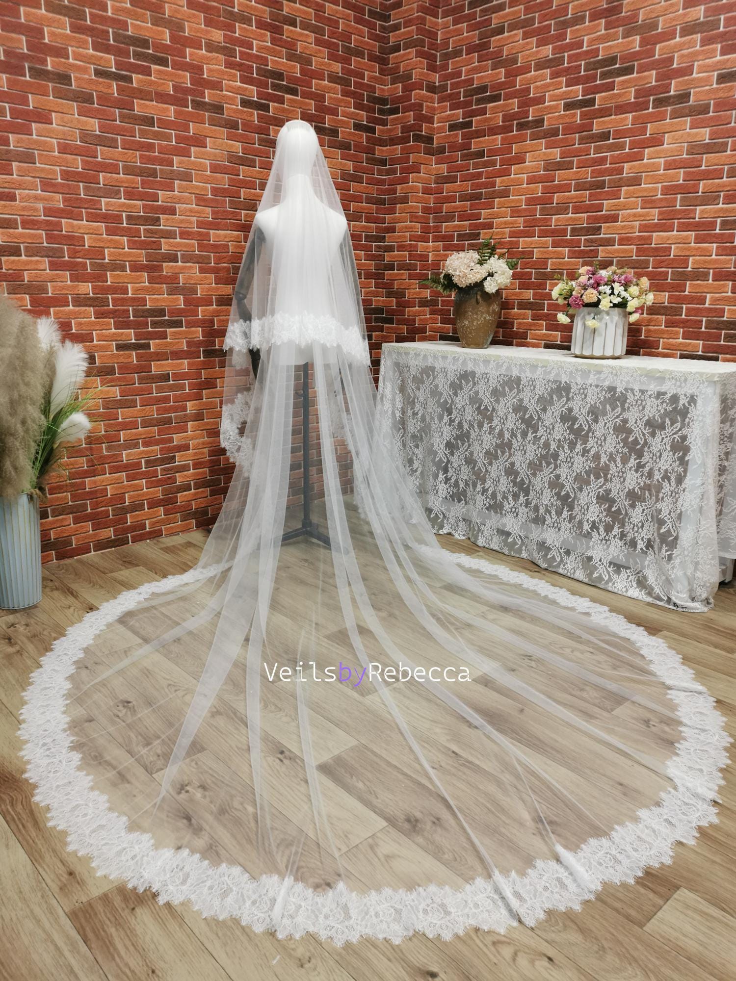 This gorgeous 2 tiers cathedral lace veil is so stunning! It is handmade with soft bridal illusion tulle and a gorgeous French Chantilly lace. It's floating and there is no obvious signs of a comb or bunching on the top of the veil. A metal comb is attached to it. If you don't need a comb attached, please let me know in your order note.