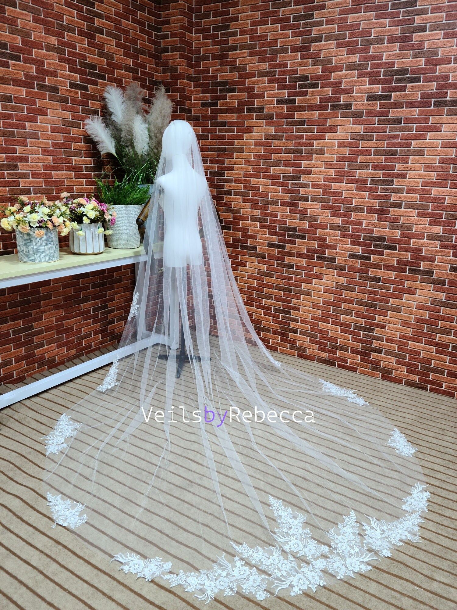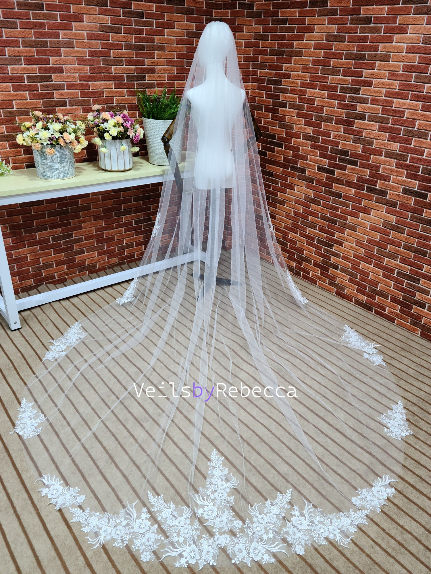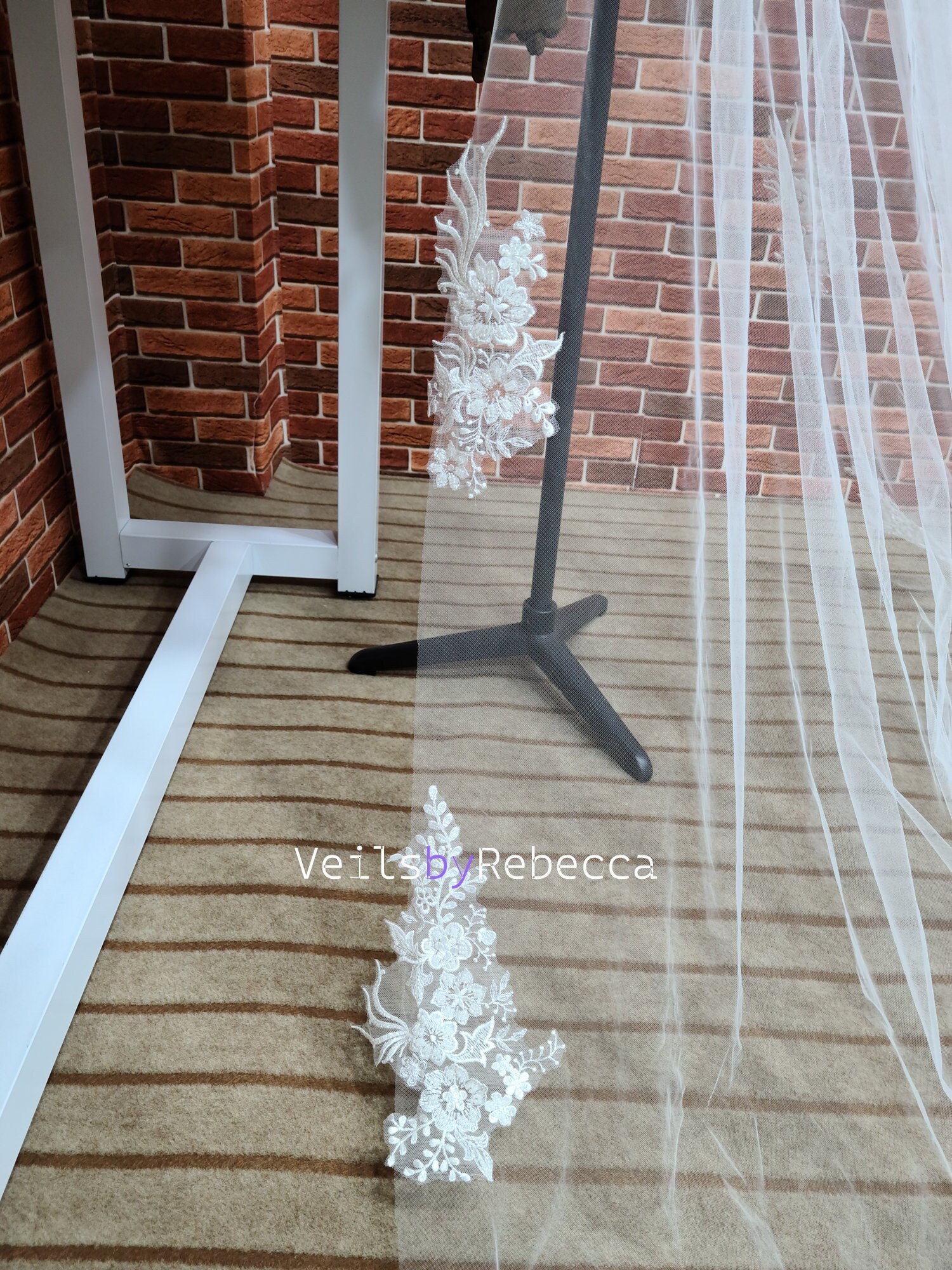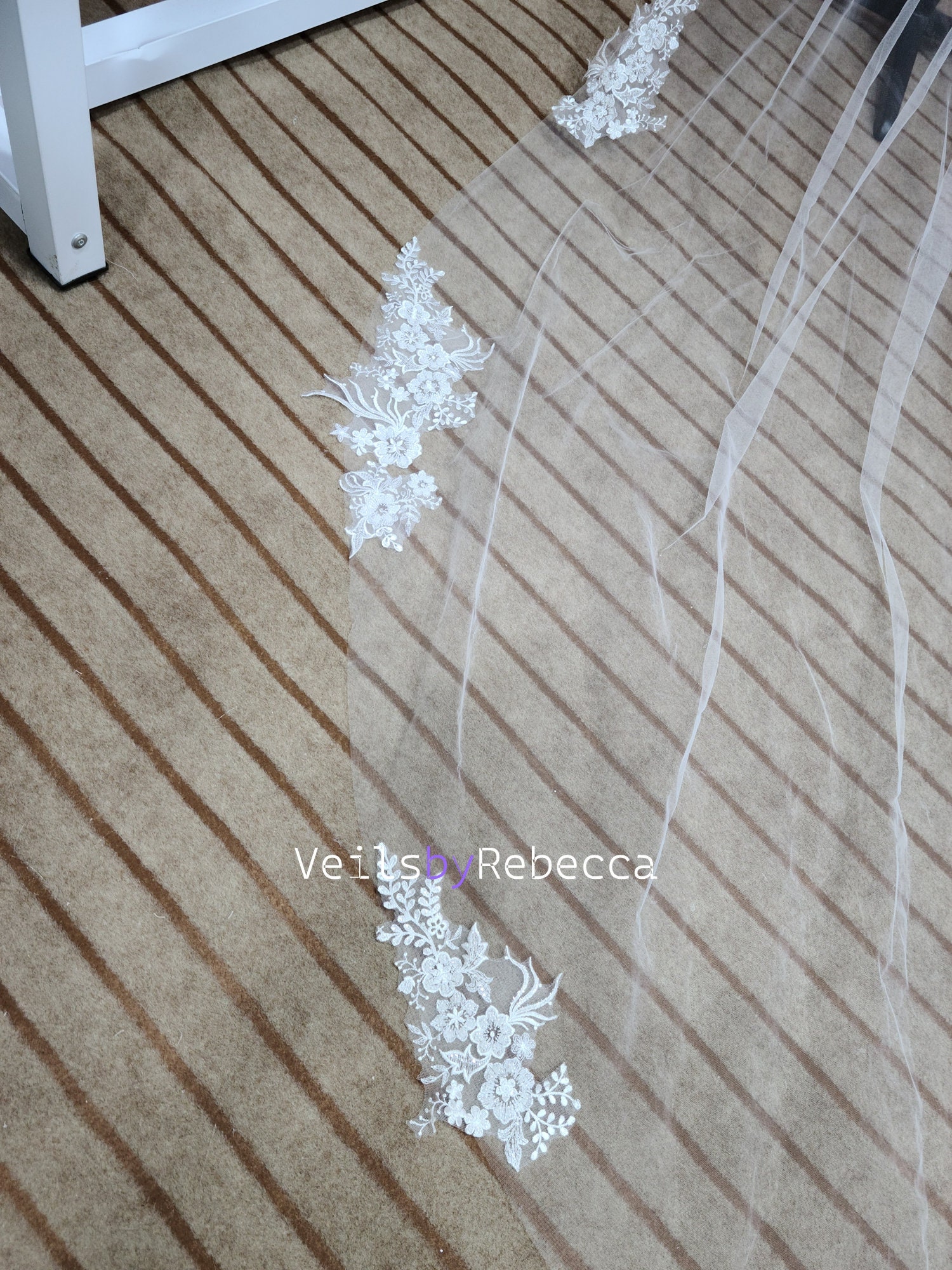 1 tier ,ivory color, gorgeous beading floral embroidery lace appliques are scattered on the edge of the veil from fingertip ,it's raw cut edge from the hair comb to the lace starting, a good quality metal comb is included, cathedral length (around 11ft 132 inches).The width is about 90 inches. Different length has different width. The max width can be to 118 inches without extra charge. Please specify the width if you need special width.