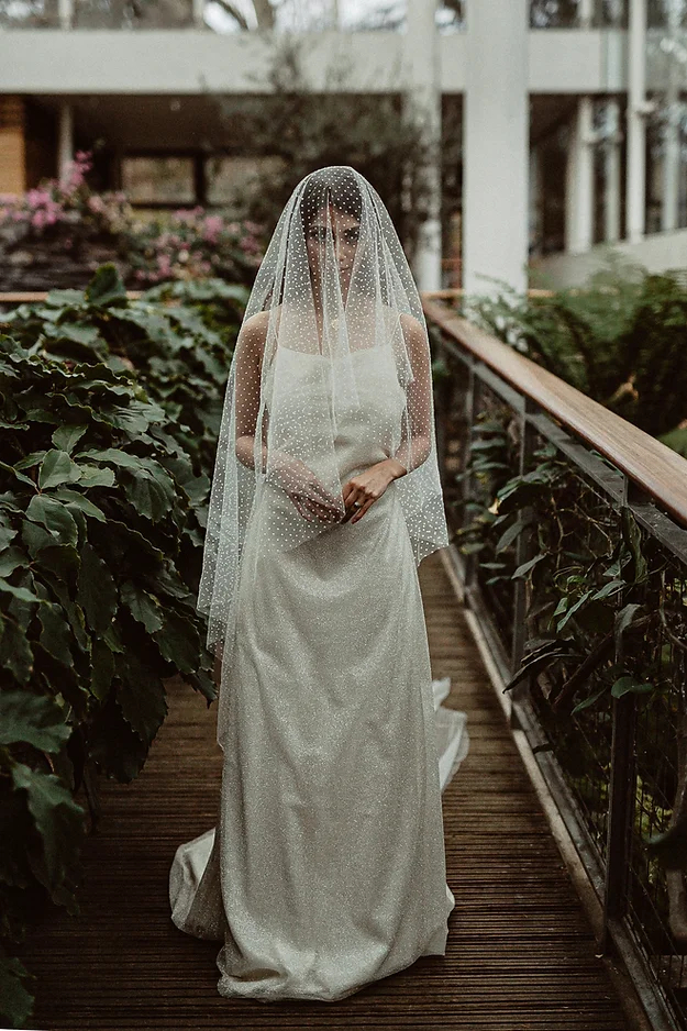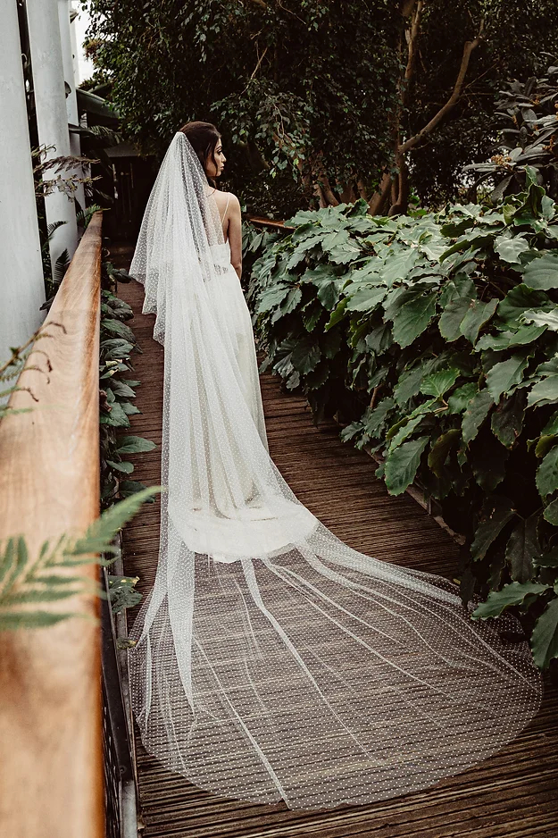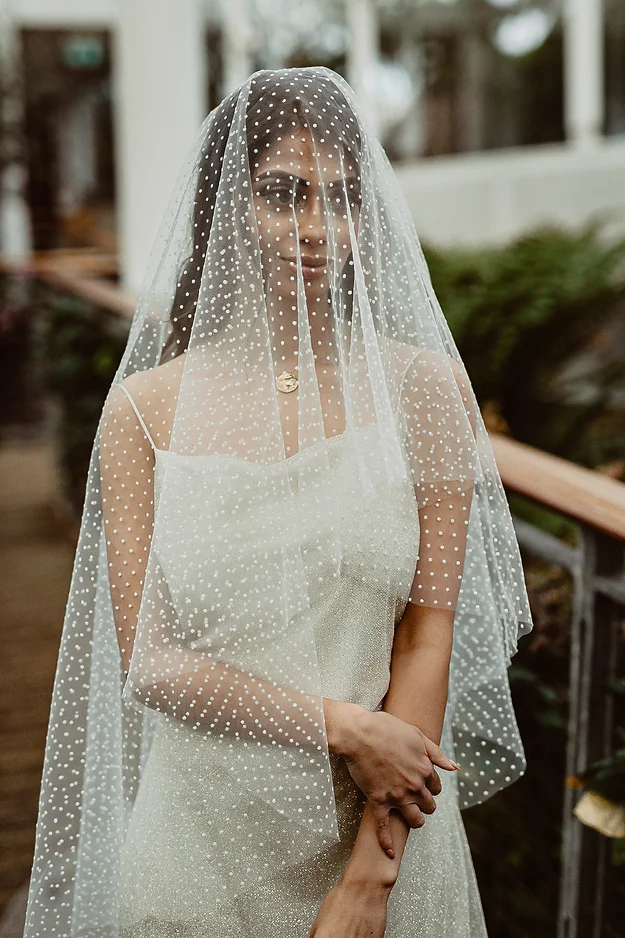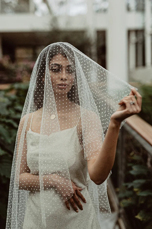 The Odette is a fun, flocked polka dot tulle veil. This veil is a drop veil, which means it doesn’t have a gather onto the comb and just falls naturally over the head. It’s soft and drapey, making for beautifully elegant photographs.
